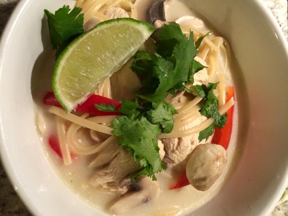 This particular dish is what you get when you add noodles to traditional Thai Tom Yum Soup. The idea for it came to me one Sunday in the bluster of January while I was sitting at one of the communal benches at Republic restaurant in NYC’s Union Square (my old neighborhood before giving up Gramercy Park for Chelsea and then Washington Heights). So I’ve ordered the noodle dish, and the guy across the table from me (we’re all strangers – it’s a communal table, remember?) ordered the Tom Yum soup – one of my all-time faves, and which, on its own is very satisfying. But I was craving noodles, and mine came with a creamy coconut sauce, with chicken and some vegetables.